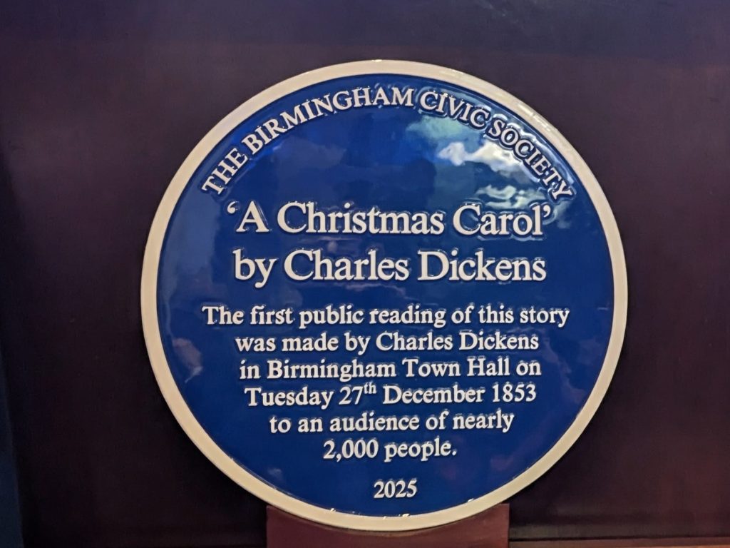 The blue plaque, awarded by Birmingham Civic Society, honours how Dickens gave his first public reading of A Christmas Carol at Birmingham Town Hall on December 27, 1853. It will be erected in the atrium of the building.